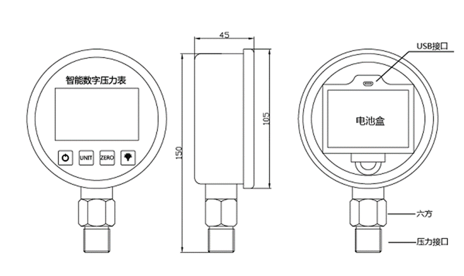 SUAY80智能壓力表是一款高精度智能型數(shù)字壓力表,內(nèi)置高精度壓力傳感器,能夠準(zhǔn)確的實(shí)時(shí)顯示壓力,并且具有精度高、長(zhǎng)期穩(wěn)定性好的特點(diǎn)。配備5位顯示的大尺寸LCD液晶顯示,具有清零、背光、開關(guān)機(jī)、單位切換、低電壓報(bào)警、峰值記錄等多種功能,操作簡(jiǎn)單,安裝方便。殼體和接頭采用304不銹鋼,抗震性好,能夠測(cè)量氣體、液體、油等對(duì)不銹鋼無(wú)腐蝕的介質(zhì)。用3節(jié)5號(hào)電池供電,也可以采用USB供電,續(xù)航功耗低、時(shí)間長(zhǎng),適用于便攜式壓力測(cè)量、設(shè)備配套、校驗(yàn)設(shè)備等壓力測(cè)量領(lǐng)域。